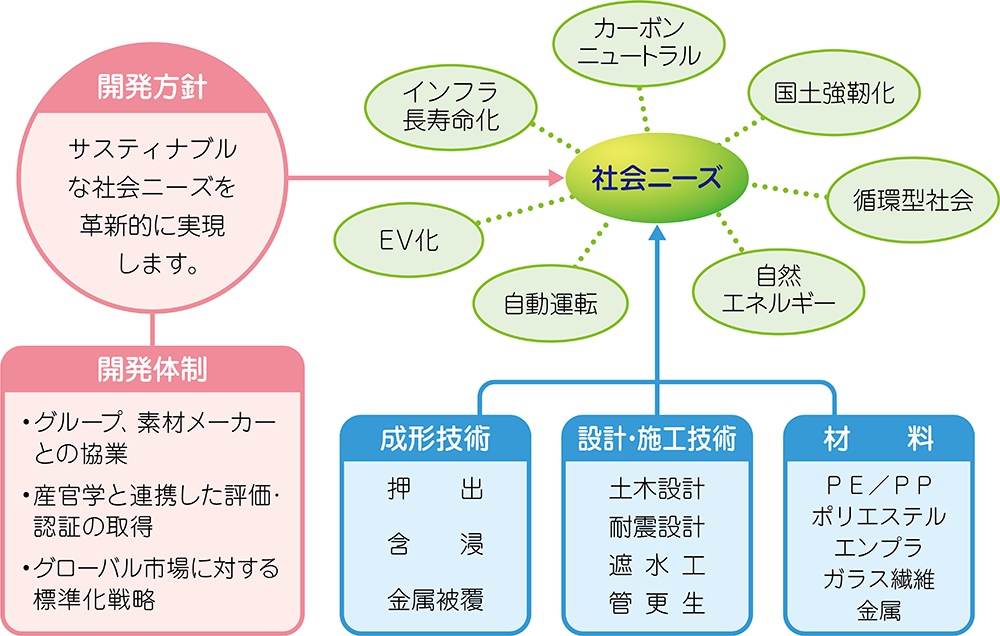 当社は独自技術をベースに商品だけではなく土木資材・環境資材の開発・設計・施工のトータルソリューションの提供により安全・安心な社会インフラと地球環境保護に貢献しています。